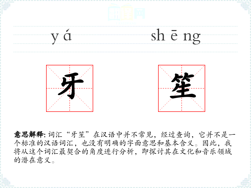 由于“牙笙”不是一个标准的汉语词汇,我们无法给出确切的基本定义。但我们可以推测,如果“牙笙”是指某种乐器,那么它可能是由“牙”(可能是指象牙或其他材质的牙齿形状部件)和“笙”(一种**传统乐器,由多个竹管组成)组合而成的乐器。