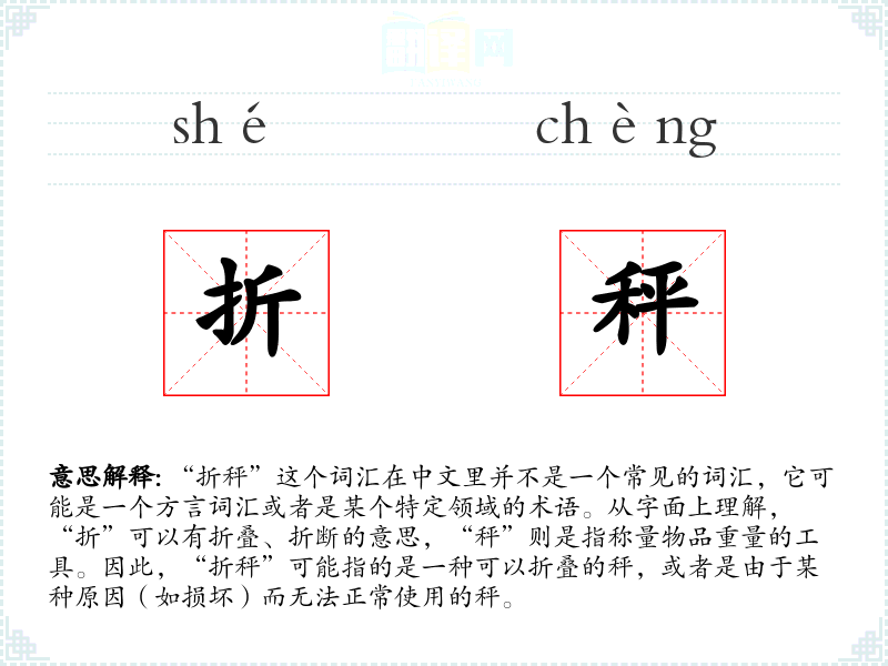 “折秤”这个词汇在中文里并不是一个常见的词汇,它可能是一个方言词汇或者是某个特定领域的术语。从字面上理解,“折”可以有折叠、折断的意思,“秤”则是指称量物品重量的工具。因此,“折秤”可能指的是一种可以折叠的秤,或者是由于某种原因(如损坏)而无法正常使用的秤。
