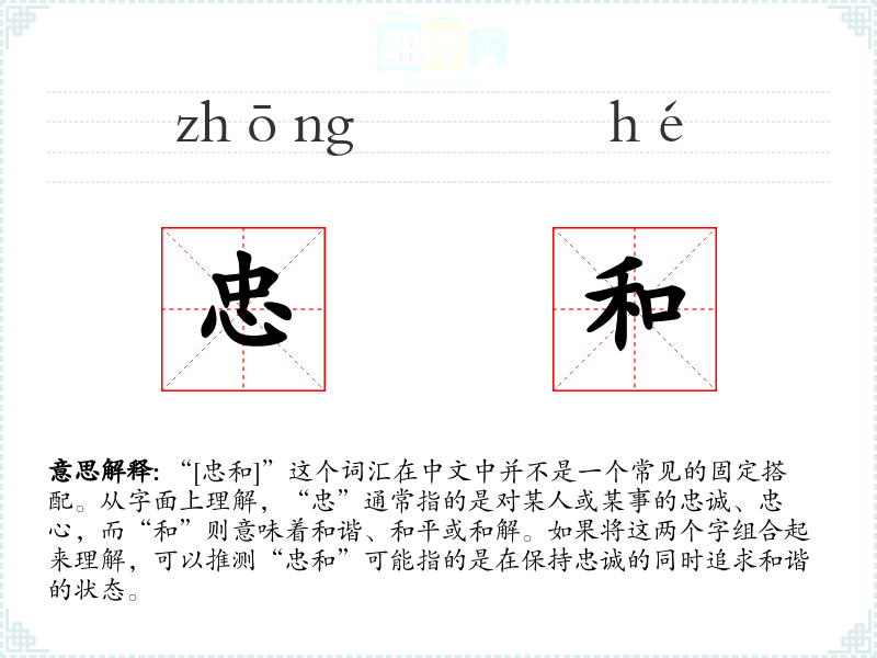“忠”和“和”都是汉语中的古老词汇,有着悠久的历史。“忠”源自对君主的忠诚,后来泛指对任何对象的忠诚;“和”则源自音乐的和谐,后引申为各种和谐状态。将这两个字组合在一起,可能是现代语境下的创新用法。