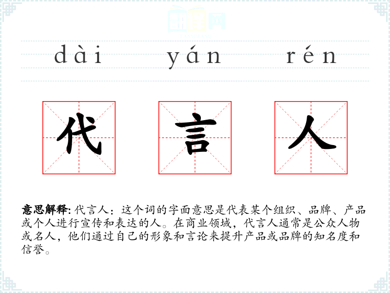 代言人:这个词的字面意思是代表某个组织、品牌、产品或个人进行宣传和表达的人。在商业领域,代言人通常是公众人物或名人,他们通过自己的形象和言论来提升产品或品牌的知名度和信誉。