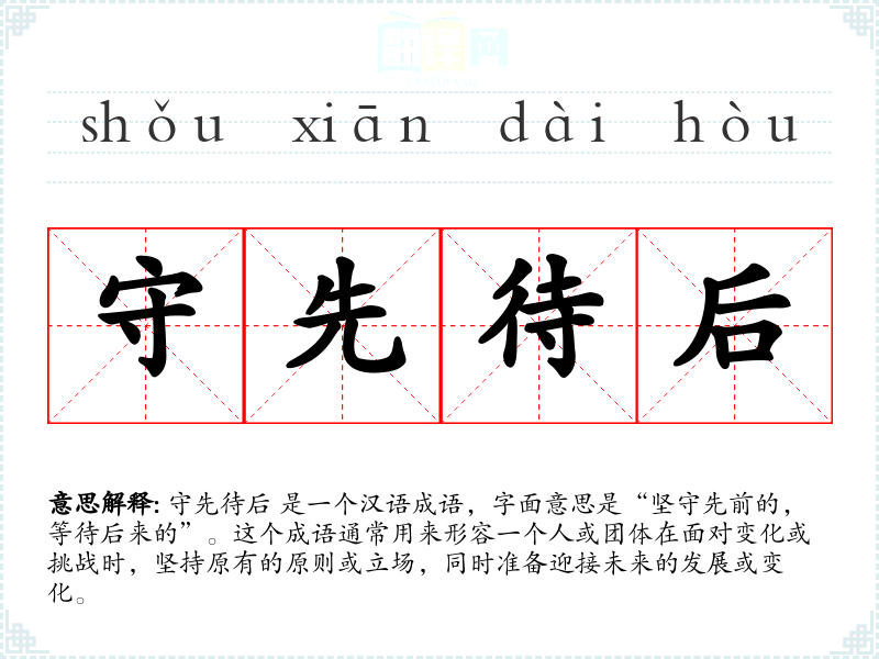 在英语中,类似的表达可能是 "stand firm and wait for the future" 或 "hold fast to the past while preparing for the future",虽然不如守先待后简洁,但也传达了相似的意思。