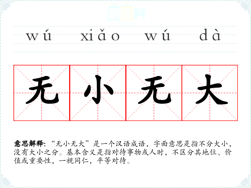 “无小无大”是一个汉语成语,字面意思是指不分大小,没有大小之分。基本含义是指对待事物或人时,不区分其地位、价值或重要性,一视同仁,平等对待。