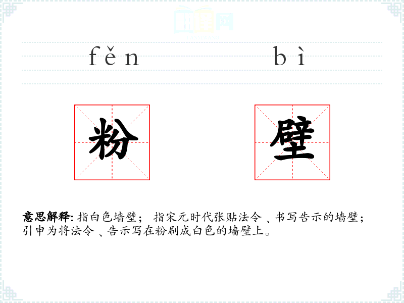指白色墙壁; 指宋元时代张贴法令﹑书写告示的墙壁; 引申为将法令﹑告示写在粉刷成白色的墙壁上。