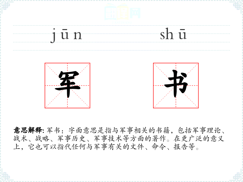 军书:字面意思是指与军事相关的书籍,包括军事理论、战术、战略、军事历史、军事技术等方面的著作。在更广泛的意义上,它也可以指代任何与军事有关的文件、命令、报告等。