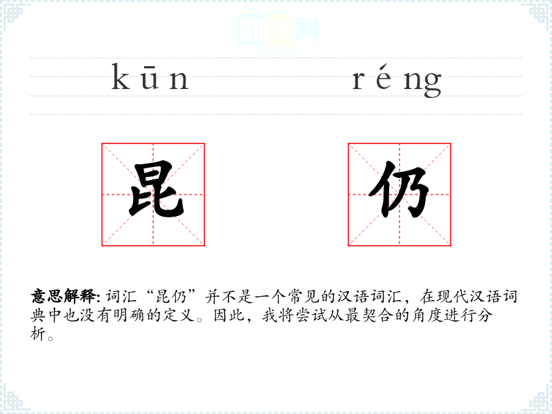 综上所述,词汇“昆仍”在现代汉语中没有明确的定义和使用,因此无法进行深入的学习和分析。如果这是一个特定领域的术语或者是某个方言词汇,可能需要更具体的信息和语境来进行分析。
