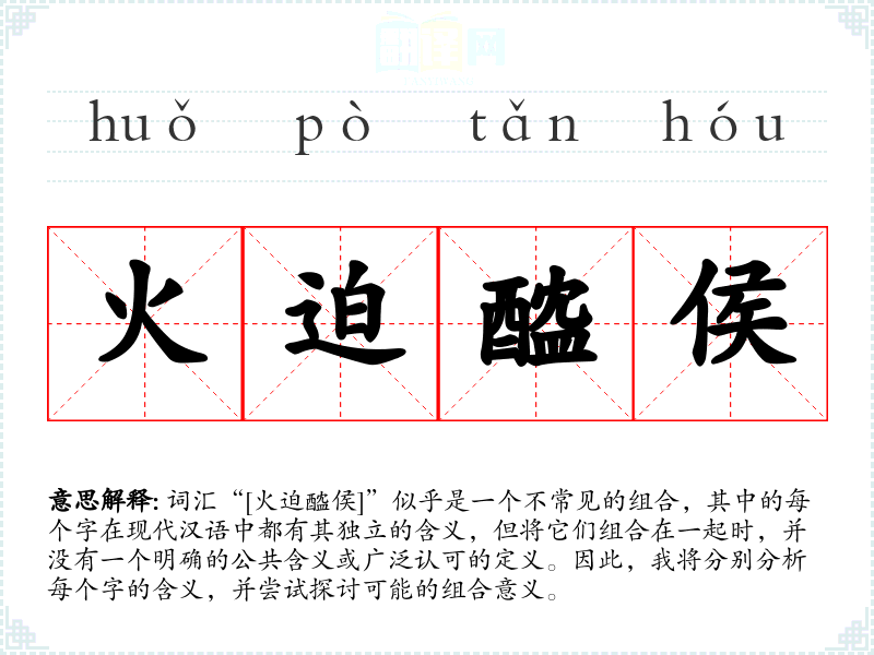 词汇“[火迫醓侯]”似乎是一个不常见的组合,其中的每个字在现代汉语中都有其独立的含义,但将它们组合在一起时,并没有一个明确的公共含义或广泛认可的定义。因此,我将分别分析每个字的含义,并尝试探讨可能的组合意义。