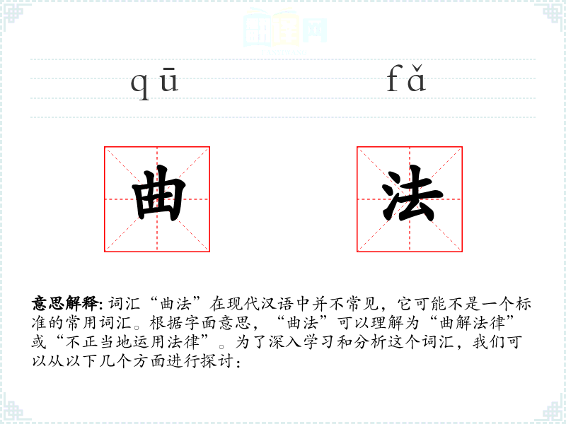 词汇“曲法”在现代汉语中并不常见,它可能不是一个标准的常用词汇。根据字面意思,“曲法”可以理解为“曲解法律”或“不正当地运用法律”。为了深入学习和分析这个词汇,我们可以从以下几个方面进行探讨:
