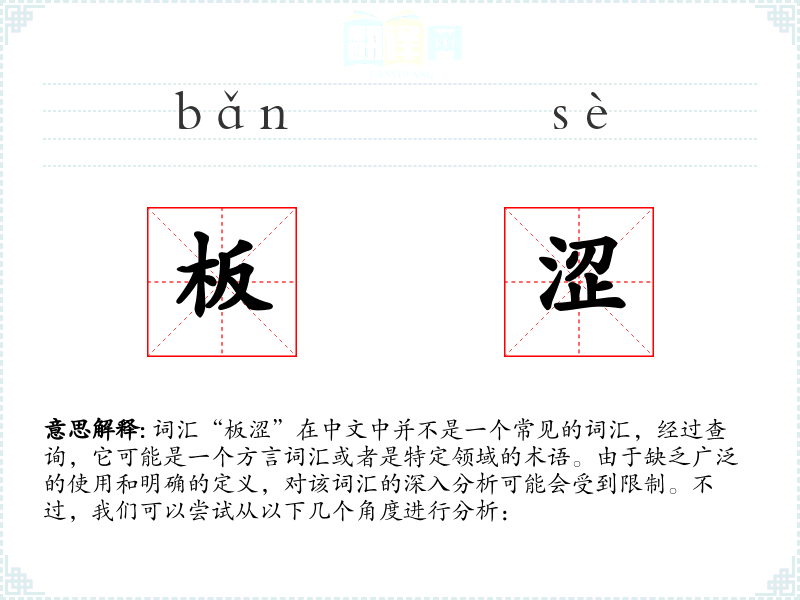 由于“板涩”不是一个标准汉语词汇,我们无法给出一个确切的字面意思和基本含义。它可能是形容某物表面硬而粗糙,或者口感生硬、不易下咽的形容词。