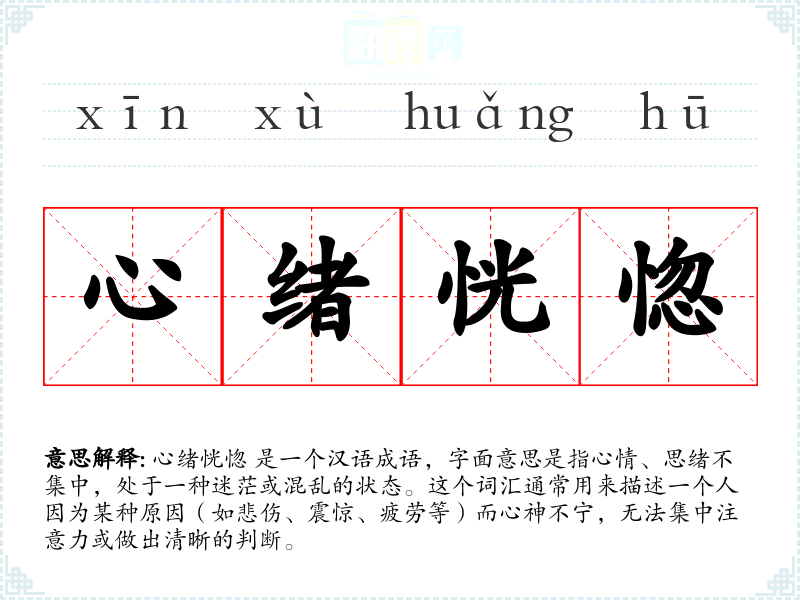 心绪恍惚 是一个汉语成语,字面意思是指心情、思绪不集中,处于一种迷茫或混乱的状态。这个词汇通常用来描述一个人因为某种原因(如悲伤、震惊、疲劳等)而心神不宁,无法集中注意力或做出清晰的判断。