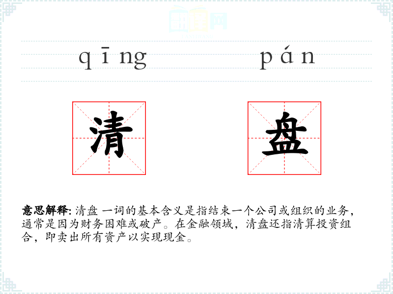 清盘 一词源自商业和金融领域,最初指的是清算账目,后来扩展到指结束业务活动。随着商业实践的发展,其含义逐渐固定为指公司或组织的正式解散。