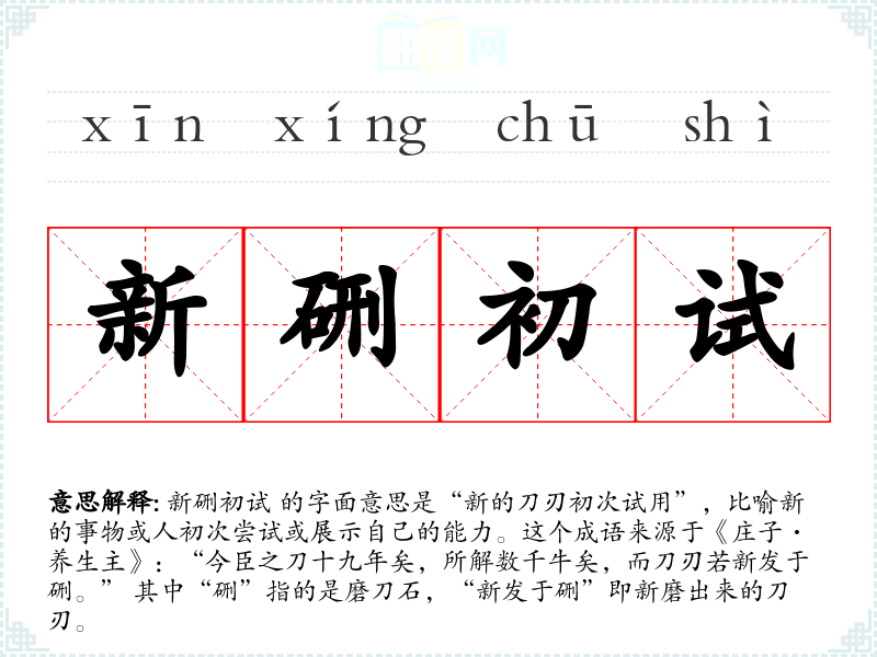 新硎初试 的字面意思是“新的刀刃初次试用”,比喻新的事物或人初次尝试或展示自己的能力。这个成语来源于《庄子·养生主》:“今臣之刀十九年矣,所解数千牛矣,而刀刃若新发于硎。” 其中“硎”指的是磨刀石,“新发于硎”即新磨出来的刀刃。