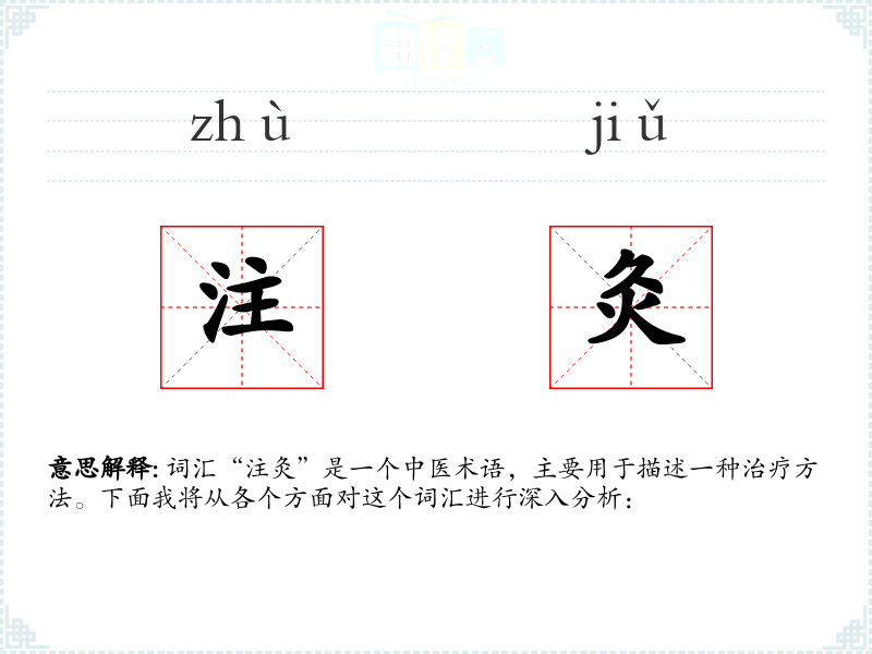 词汇“注灸”是一个中医术语,主要用于描述一种治疗方法。下面我将从各个方面对这个词汇进行深入分析: