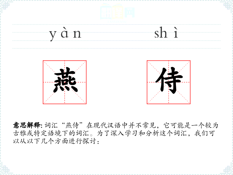 词汇“燕侍”在现代汉语中并不常见,它可能是一个较为古雅或特定语境下的词汇。为了深入学*和分析这个词汇,我们可以从以下几个方面进行探讨: