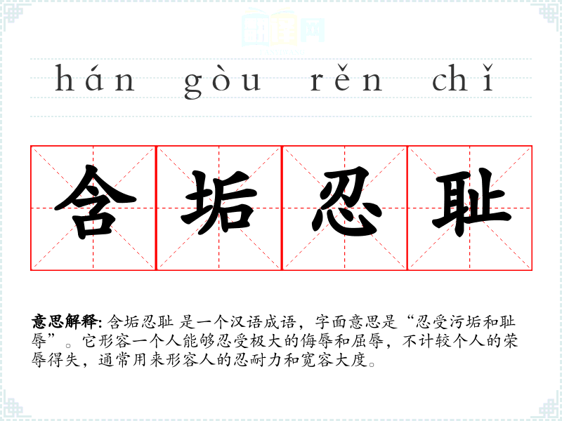 含垢忍耻 是一个汉语成语,字面意思是“忍受污垢和耻辱”。它形容一个人能够忍受极大的侮辱和屈辱,不计较个人的荣辱得失,通常用来形容人的忍耐力和宽容大度。