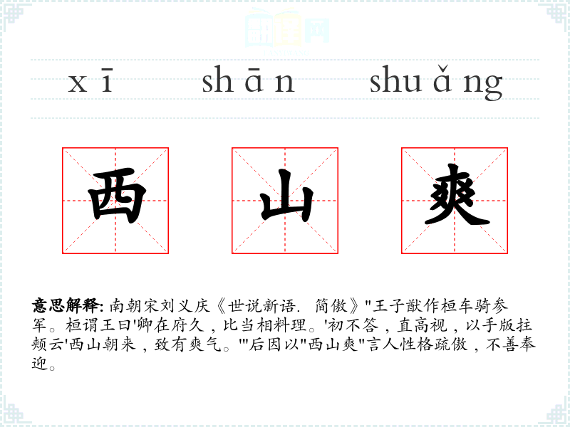 南朝宋刘义庆《世说新语.简傲》"王子猷作桓车骑参军。桓谓王曰'卿在府久﹐比当相料理。'初不答﹐直高视﹐以手版拄颊云'西山朝来﹐致有爽气。'"后因以"西山爽"言人性格疏傲﹐不善奉迎。