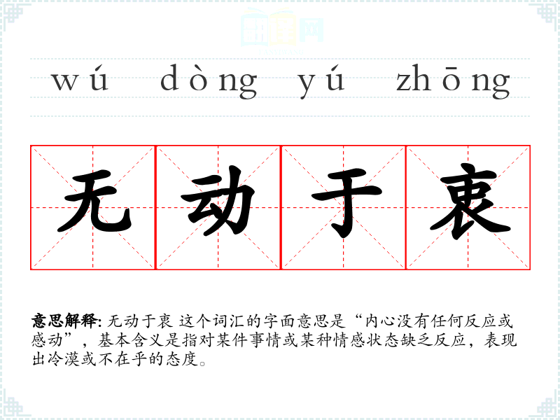 无动于衷 这个词汇的字面意思是“内心没有任何反应或感动”,基本含义是指对某件事情或某种情感状态缺乏反应,表现出冷漠或不在乎的态度。