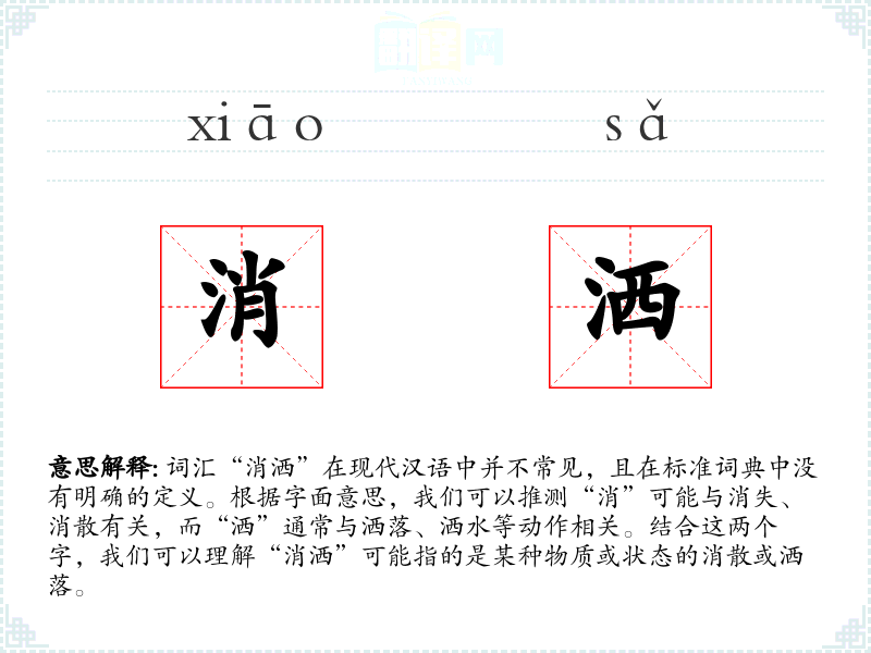 词汇“消洒”在现代汉语中并不常见,且在标准词典中没有明确的定义。根据字面意思,我们可以推测“消”可能与消失、消散有关,而“洒”通常与洒落、洒水等动作相关。结合这两个字,我们可以理解“消洒”可能指的是某种物质或状态的消散或洒落。
