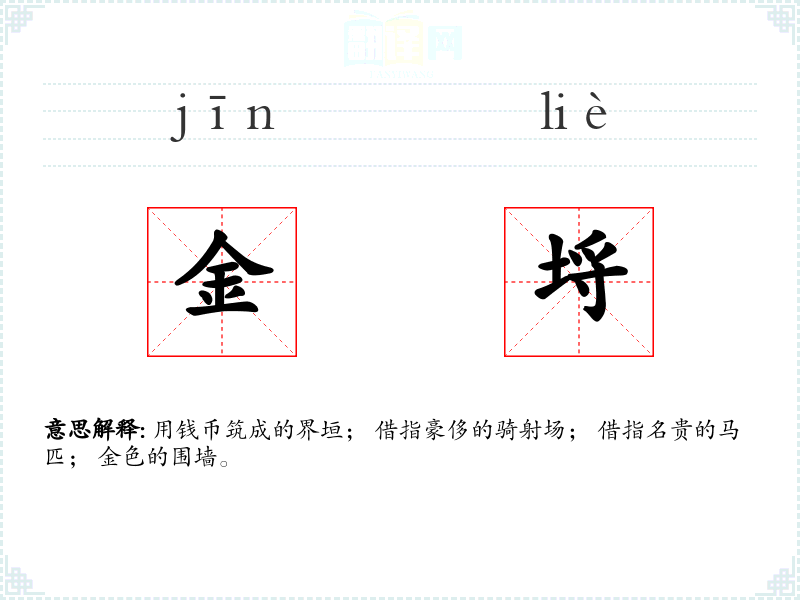 用钱币筑成的界垣; 借指豪侈的骑射场; 借指名贵的马匹; 金色的围墙。