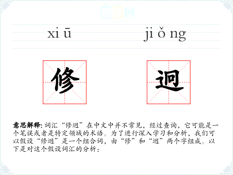词汇“修迥”在中文中并不常见,经过查询,它可能是一个笔误或者是特定领域的术语。为了进行深入学习和分析,我们可以假设“修迥”是一个组合词,由“修”和“迥”两个字组成。以下是对这个假设词汇的分析:
