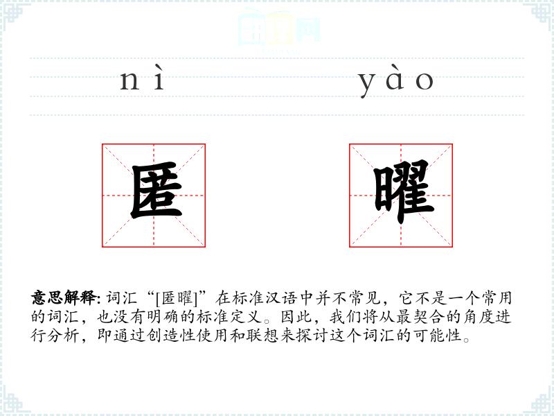 词汇“[匿曜]”在标准汉语中并不常见,它不是一个常用的词汇,也没有明确的标准定义。因此,我们将从最契合的角度进行分析,即通过创造性使用和联想来探讨这个词汇的可能性。