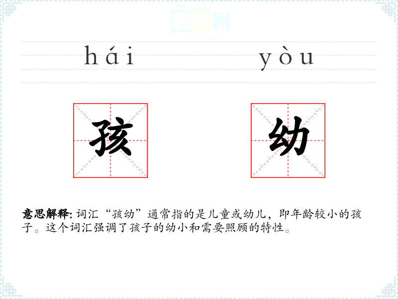 词汇“孩幼”通常指的是儿童或幼儿,即年龄较小的孩子。这个词汇强调了孩子的幼小和需要照顾的特性。