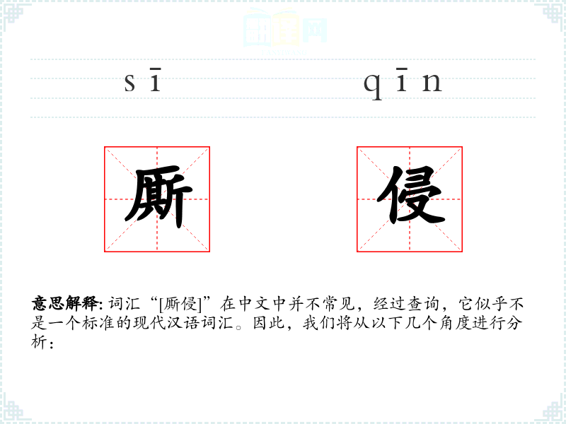 由于“[厮侵]”不是一个标准的现代汉语词汇,我们无法对其进行深入的分析和理解。在语言学习和表达中,我们应当关注那些常见且有明确意义的词汇,以确保沟通的有效性和准确性。对于不常见的词汇,我们应当谨慎使用,并在必要时进行详细的解释和说明。