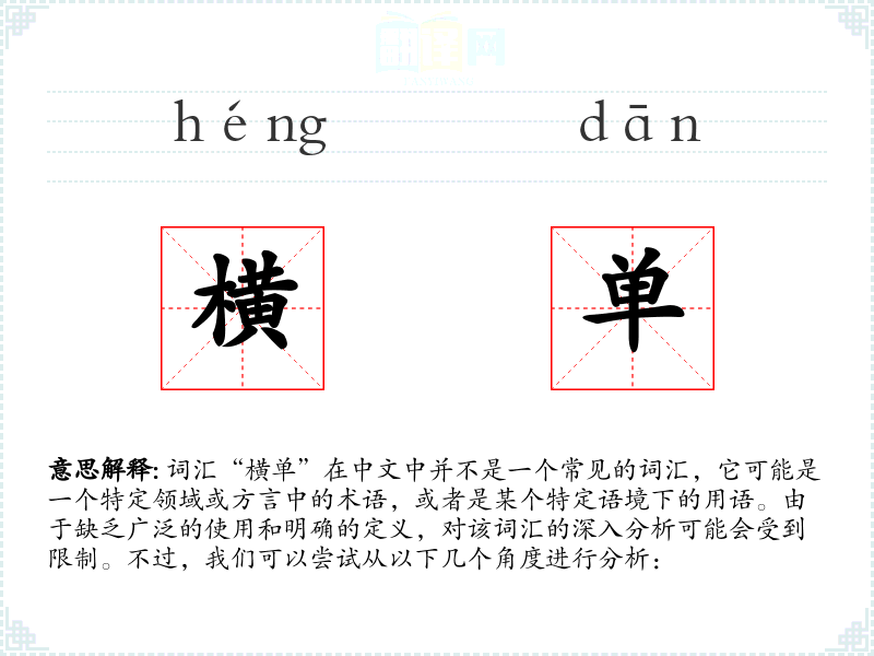 由于“横单”不是一个标准词汇,我们无法给出一个确切的字面意思和基本含义。它可能是指某种横向的单据或列表,或者是某个特定行业或地区的术语。