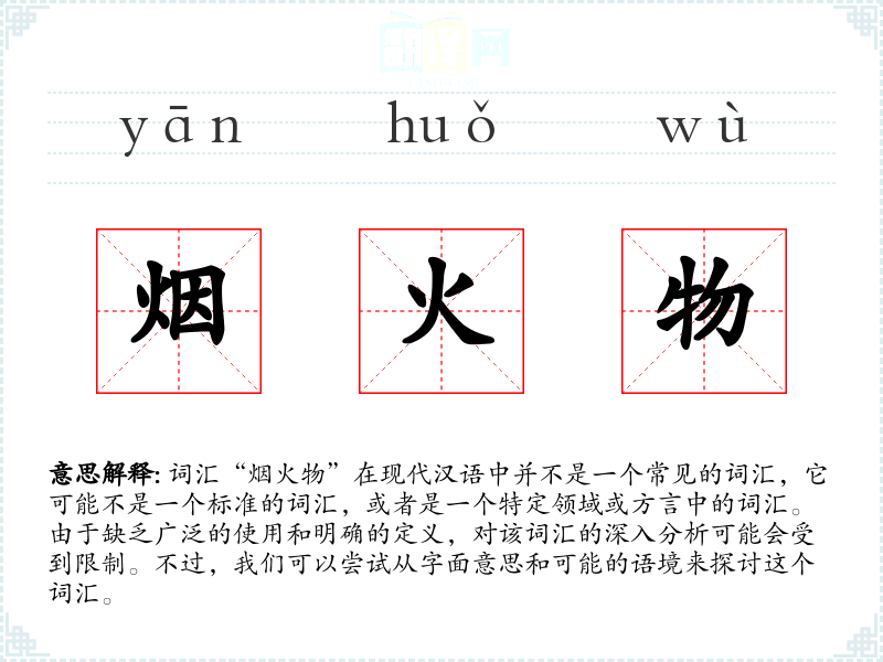 由于“烟火物”不是一个常见词汇,对其的深入分析受到限制。如果它是一个特定领域或方言中的词汇,可能需要更多的语言学研究和具体语境来理解其含义和使用。在语言学*和表达中,了解词汇的背景和语境是非常重要的,特别是对于不常见的词汇。