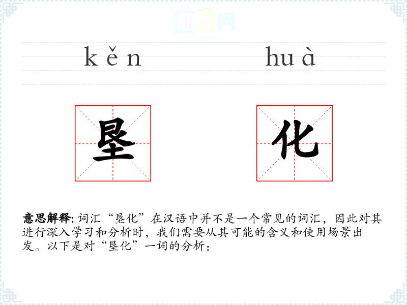 词汇“垦化”在汉语中并不是一个常见的词汇,因此对其进行深入学*和分析时,我们需要从其可能的含义和使用场景出发。以下是对“垦化”一词的分析: