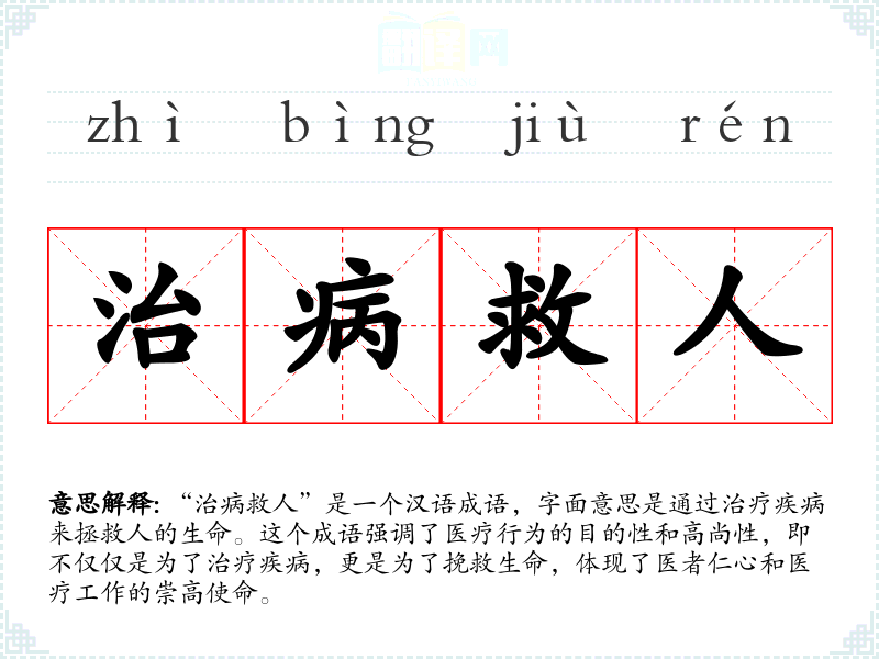 “治病救人”是一个汉语成语,字面意思是通过治疗疾病来拯救人的生命。这个成语强调了医疗行为的目的性和高尚性,即不仅仅是为了治疗疾病,更是为了挽救生命,体现了医者仁心和医疗工作的崇高使命。