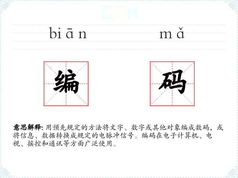 用预先规定的方法将文字、数字或其他对象编成数码,或将信息、数据转换成规定的电脉冲信号。编码在电子计算机、电视、摇控和通讯等方面广泛使用。