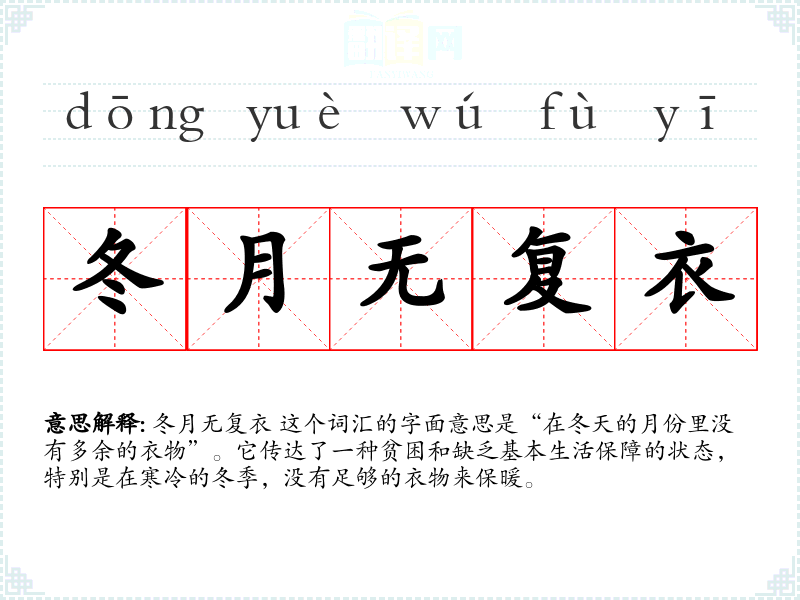 冬月无复衣 这个词汇的字面意思是“在冬天的月份里没有多余的衣物”。它传达了一种贫困和缺乏基本生活保障的状态,特别是在寒冷的冬季,没有足够的衣物来保暖。