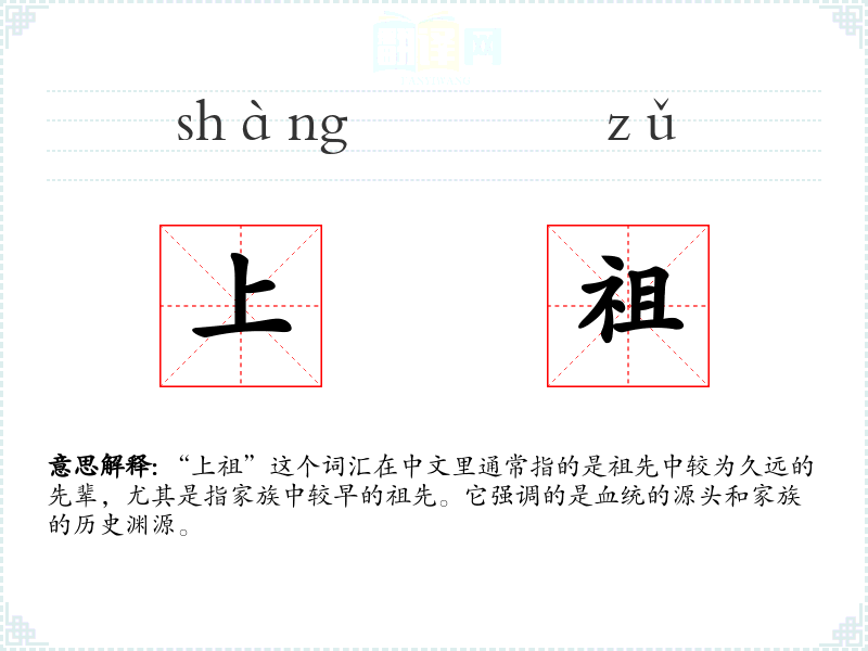 “上祖”这个词汇在中文里通常指的是祖先中较为久远的先辈,尤其是指家族中较早的祖先。它强调的是血统的源头和家族的历史渊源。