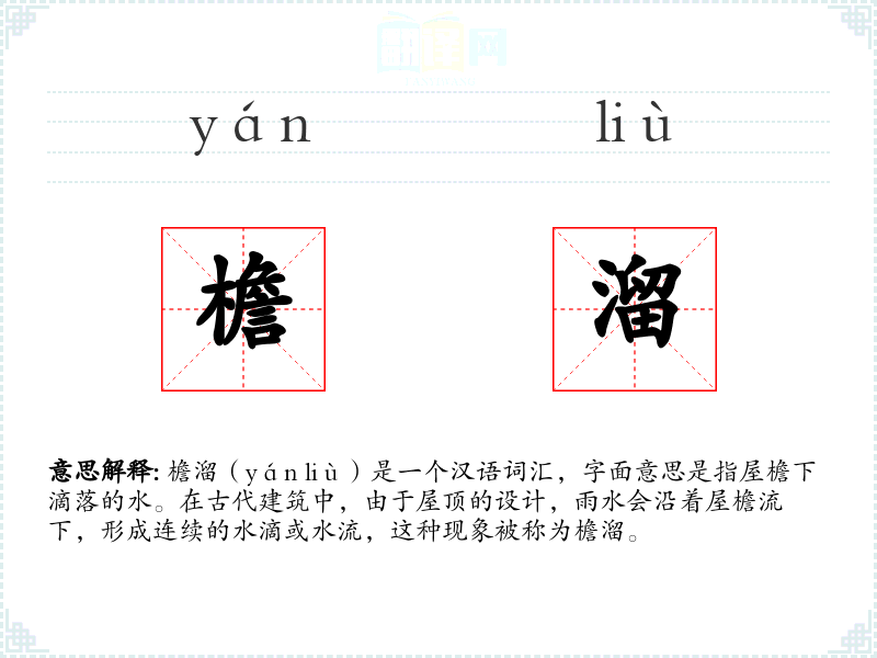 - 同义词:屋檐滴水、檐水、檐雨