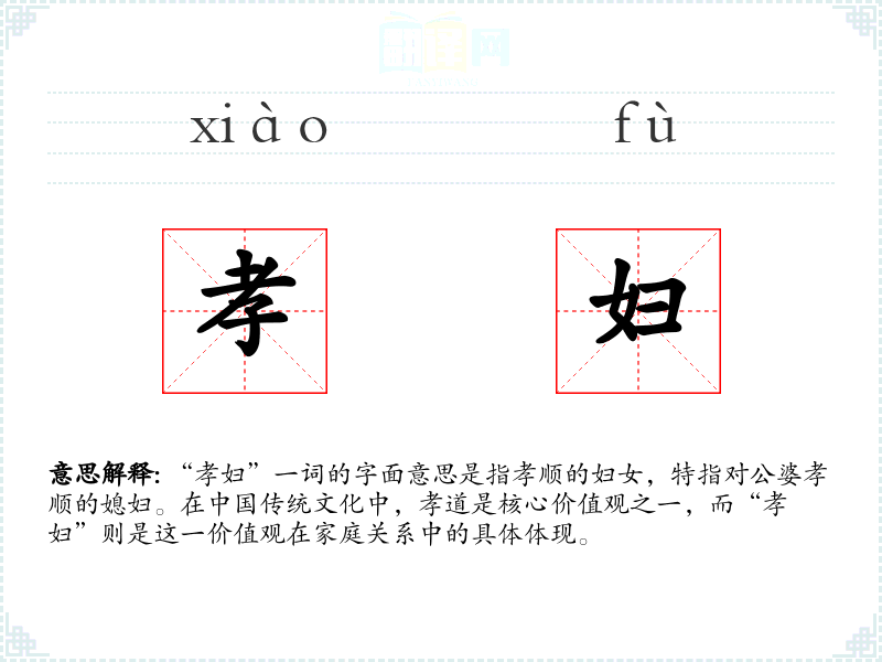 “孝妇”一词的字面意思是指孝顺的妇女,特指对公婆孝顺的媳妇。在**传统文化中,孝道是核心价值观之一,而“孝妇”则是这一价值观在家庭关系中的具体体现。