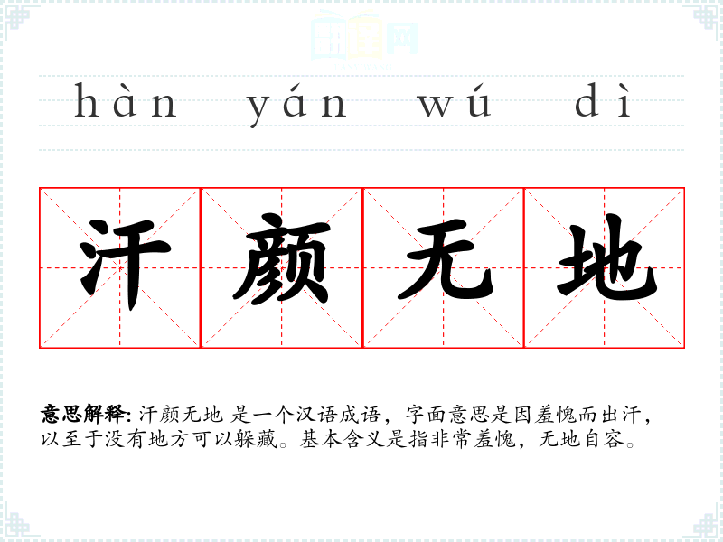 汗颜无地 是一个汉语成语,字面意思是因羞愧而出汗,以至于没有地方可以躲藏。基本含义是指非常羞愧,无地自容。