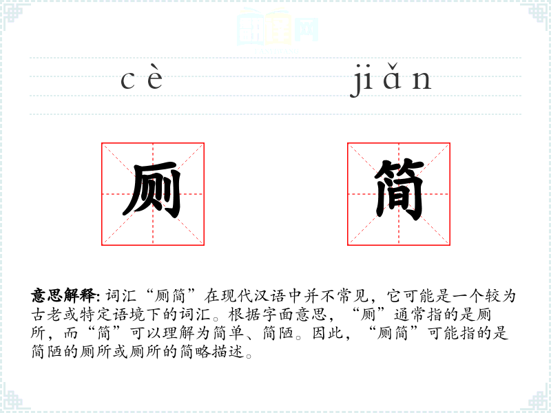 - 词源:“厕”源自古代汉语,指厕所;“简”源自古代汉语,指简单、简陋。