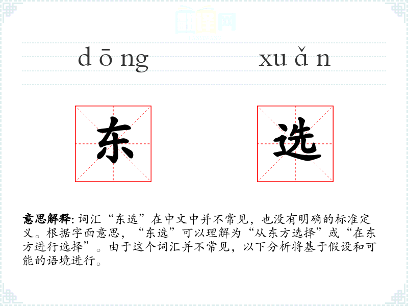 词汇“东选”在中文中并不常见,也没有明确的标准定义。根据字面意思,“东选”可以理解为“从东方选择”或“在东方进行选择”。由于这个词汇并不常见,以下分析将基于假设和可能的语境进行。
