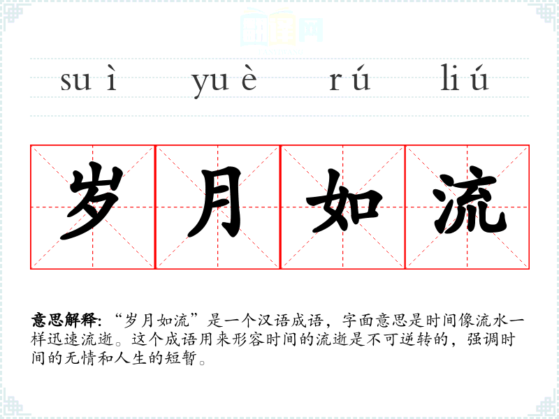 “岁月如流”是一个汉语成语,字面意思是时间像流水一样迅速流逝。这个成语用来形容时间的流逝是不可逆转的,强调时间的无情和人生的短暂。
