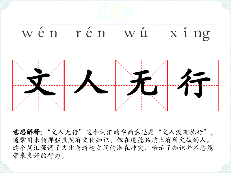 “文人无行”这个词汇的字面意思是“文人没有德行”,通常用来指那些虽然有文化知识,但在道德品质上有所欠缺的人。这个词汇强调了文化与道德之间的潜在冲突,暗示了知识并不总能带来良好的行为。