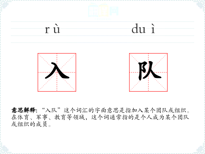 “入队”这个词源于汉语,由“入”和“队”两个字组成。在古代汉语中,“入”表示进入,“队”表示队伍或组织。随着时间的推移,这个词的含义和用法基本保持稳定。
