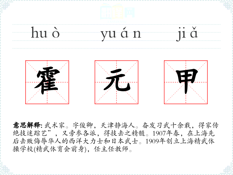 1.武术家。字俊卿,天津静海人。奋发习武十余载,得家传绝技迷踪艺”,又旁参各派,得技击之精髓。1907年春,在上海先后击败侮辱华人的西洋大力士和日本武士。1909年创立上海精武体操学校(精武体育会前身),任主任教师。