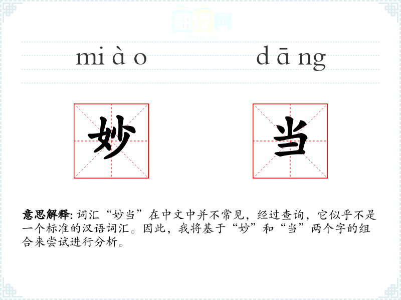 词汇“妙当”在中文中并不常见,经过查询,它似乎不是一个标准的汉语词汇。因此,我将基于“妙”和“当”两个字的组合来尝试进行分析。