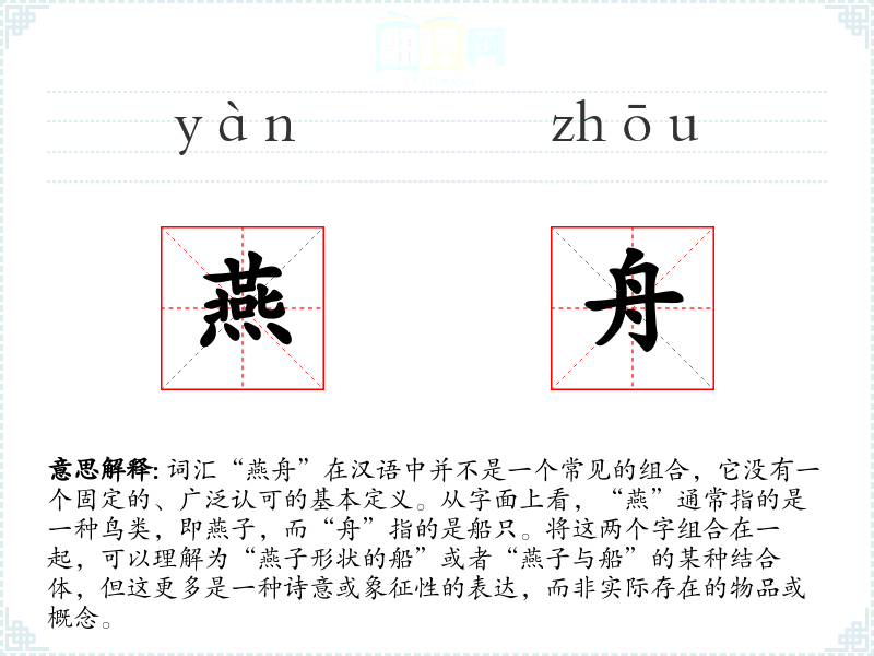 由于“燕舟”不是一个常用词汇,个人应用可能较少。它可能在一些特定的文学创作或艺术表达中出现,作为某种意境的营造。