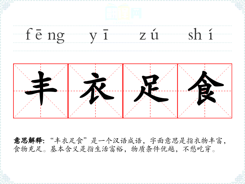 “丰衣足食”是一个汉语成语,字面意思是指衣物丰富,食物充足。基本含义是指生活富裕,物质条件优越,不愁吃穿。