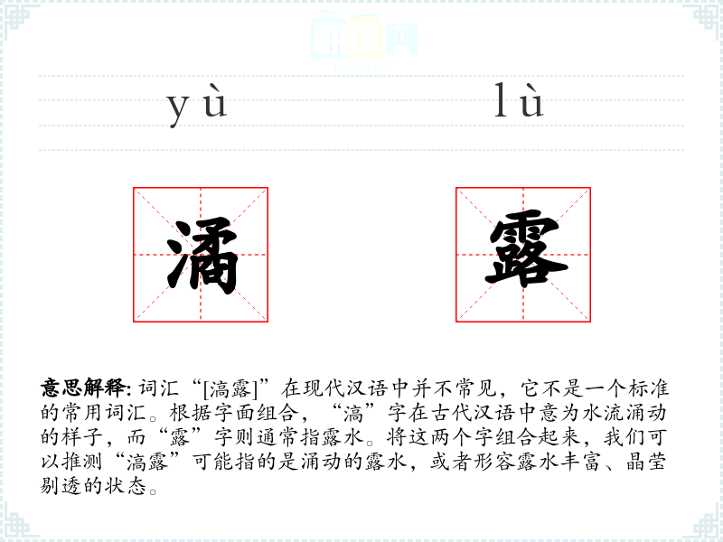 “滈”字在古代汉语中意为水流涌动的样子,而“露”字则指露水。这两个字的组合可能是古代文人用来形容露水的特殊状态,但在现代汉语中并未广泛流传和使用。