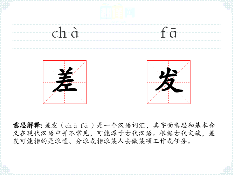 差发(chā fā)是一个汉语词汇,其字面意思和基本含义在现代汉语中并不常见,可能源于古代汉语。根据古代文献,差发可能指的是派遣、分派或指派某人去做某项工作或任务。