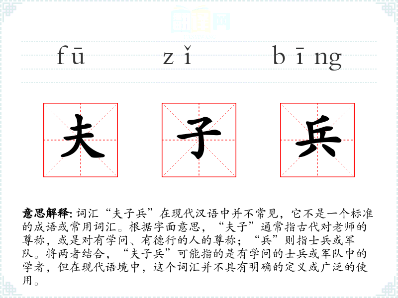 由于“夫子兵”不是一个标准词汇,我们无法给出一个确切的基本定义。它可能是某个特定领域或方言中的词汇,或者是某个特定历史时期的用语。