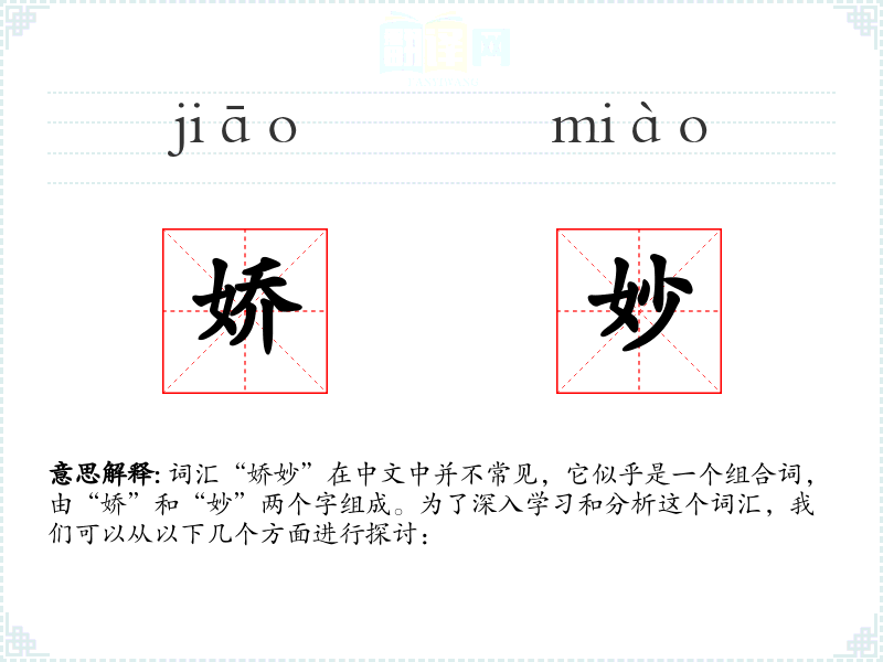 词汇“娇妙”在中文中并不常见,它似乎是一个组合词,由“娇”和“妙”两个字组成。为了深入学*和分析这个词汇,我们可以从以下几个方面进行探讨: