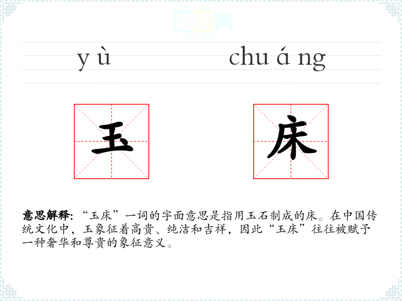 “玉床”一词的字面意思是指用玉石制成的床。在**传统文化中,玉象征着高贵、纯洁和吉祥,因此“玉床”往往被赋予一种奢华和尊贵的象征意义。